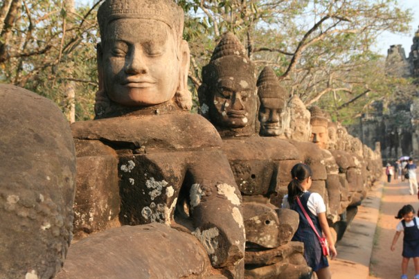 Leurs visages sévères, tournés à l’est, s’éveillent sous le soleil levant. Des éléphants passent chargés de visiteurs installés dans une nacelle, sous la porte en ogive qui fait pénétrer dans l’espace sacré. Eléphants, mais aussi bus, tuk-tuk, motos, voitures, vélos, tous à la queue leu leu s’avancent dans l’enceinte.